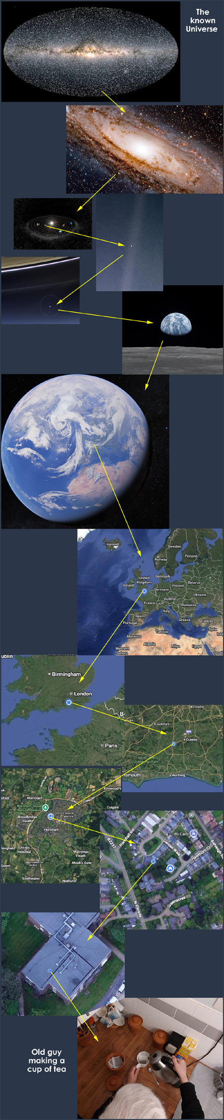 We live in a comparatively microscopic space, but as mankind evolved into consciousness and looked around at what he could see (or what she could see—let’s not be sexist) they decided that some sort of God had ordained it. Yet looking at if from the outside in—from the vast universe, to the unimaginably huge galaxy, to the gigantic solar system, and finally to the tiny blue planet called earth—the notion that we’re expected to believe a God or gods zeroed in on this sub-atomic partial of the Universe for special processing seems far-fetched to say the least.