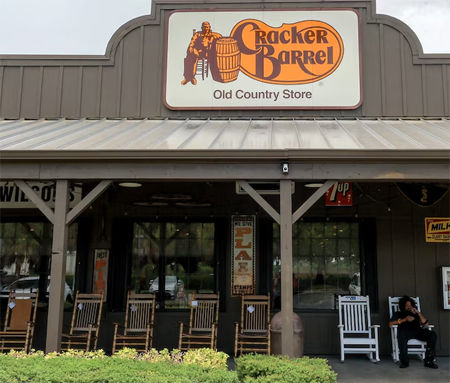 Highland cow, popular in Scotland and North Greenbush The next day, before heading back to Britain, we had our traditional family meal at Cracker Barrel, where the old logo remained and the rustic rocking chairs were still out front. Tick.