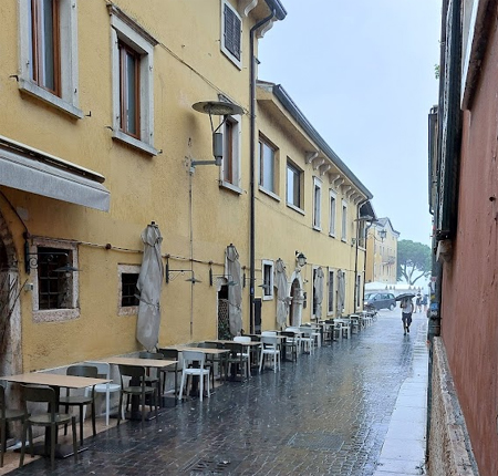 This was our Free Day, so, with the bathroom light extinguished, my wife and I walked to the nearby town of Bardolino. Once there, we found an outdoor café and were enjoying a fine cup of coffee when the wind suddenly picked up and people scurried to tie up boats, batten down hatches, and furl umbrellas. The big awning over us was taken down while we were sitting there, and the wind became so strong it was in danger of blowing the coffee out of my cup. We gulped the coffee and headed home, through the wind, rain, and thunder.