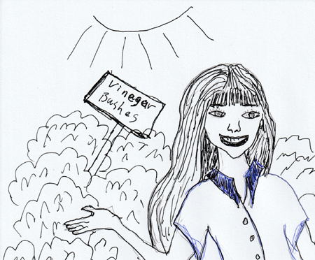 In place of a photo, here is an artist’s rendition of the fetching young lady who conducted the vinegar tour After that it was an hour and a half trip back to base. Four of us—minus Sally, who had struck out on her own (quite adventurous is our Sally)—went to dinner and had a nice chat and returned to our rooms at a reasonable time. So reasonable, I decided to have a beer and cigar on the roof garden, and Sadie joined me with another carafe of wine (she likes a drink, does Sadie).